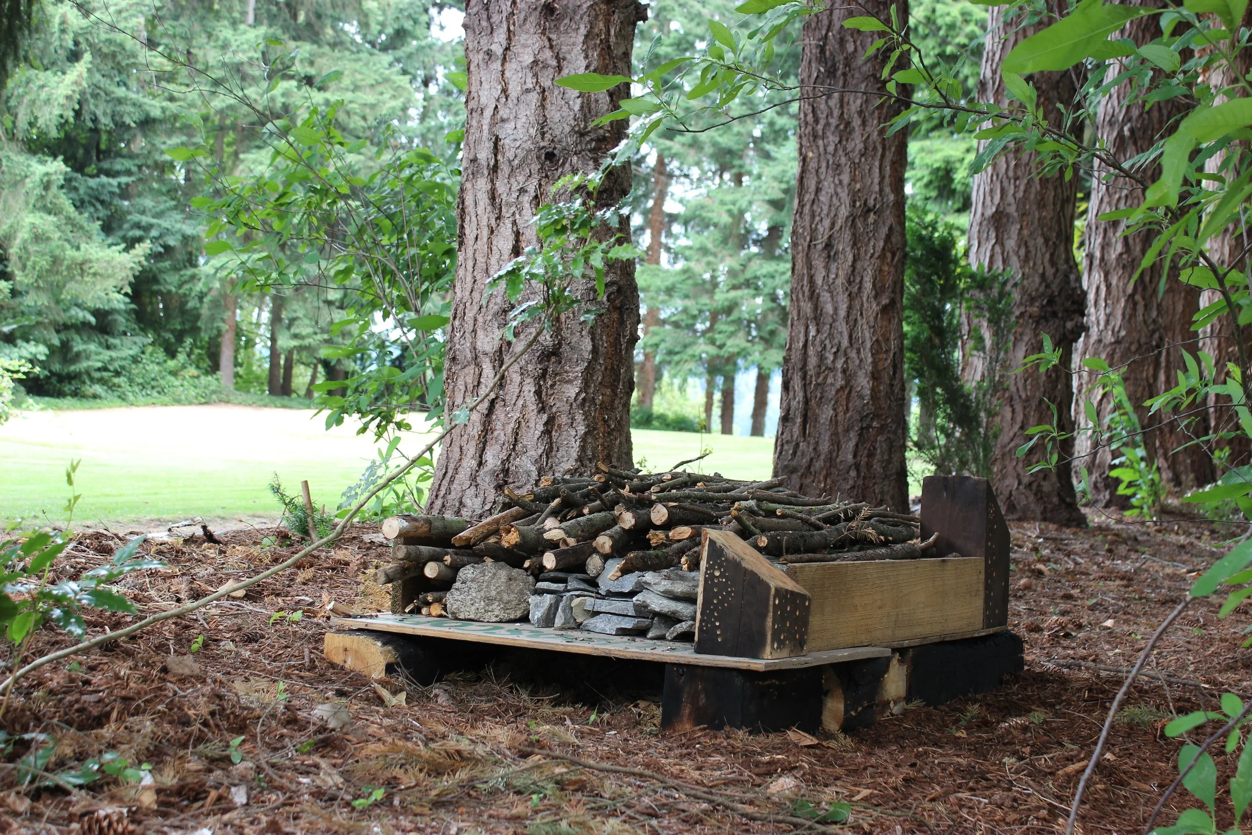 This bug barn was developed to relocate a red-tailed bumblebee nest away from a future goat plot. By creating a safe place, we can increase the chances of the queen overwintering close by. On top of the bumblebee nest, we used a mixture of rock and stone and filled the inside with air pockets, gravel, soil, and small twigs. Pillars cornered the second level, which we drilled with a variety of sized holes to provide living space for polyester bees, mason bees, leaf cutter bees, orchard bees, and carder bees. All on top of a bumblebee nest.