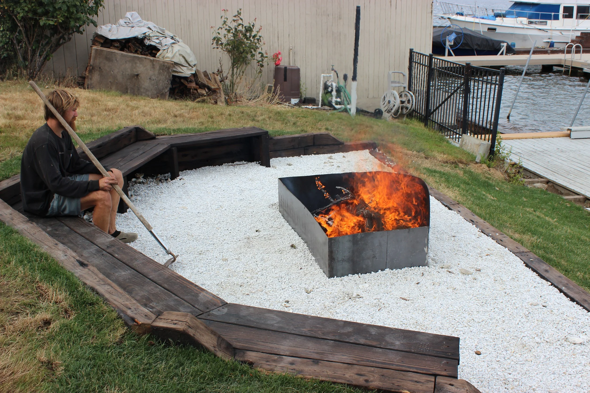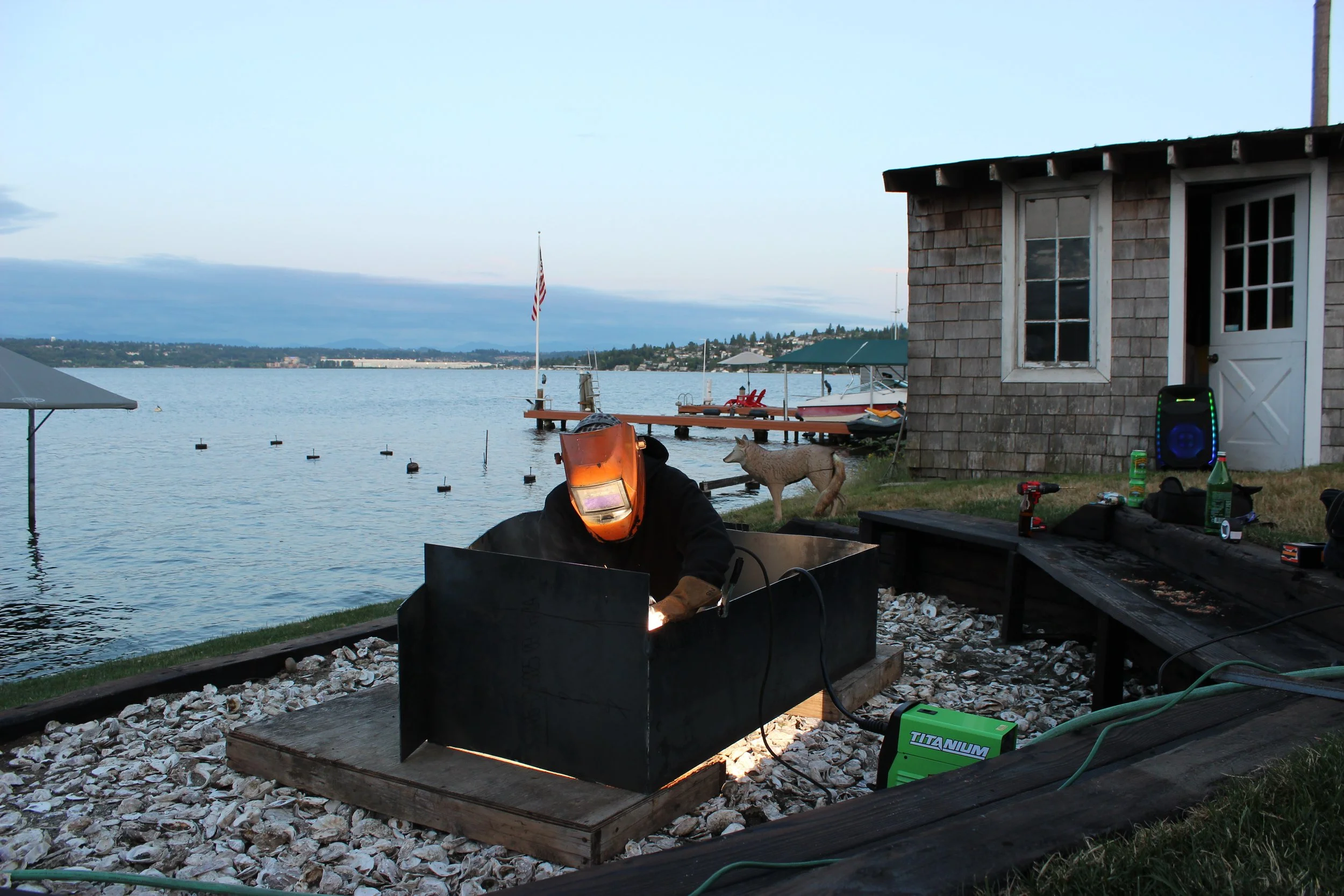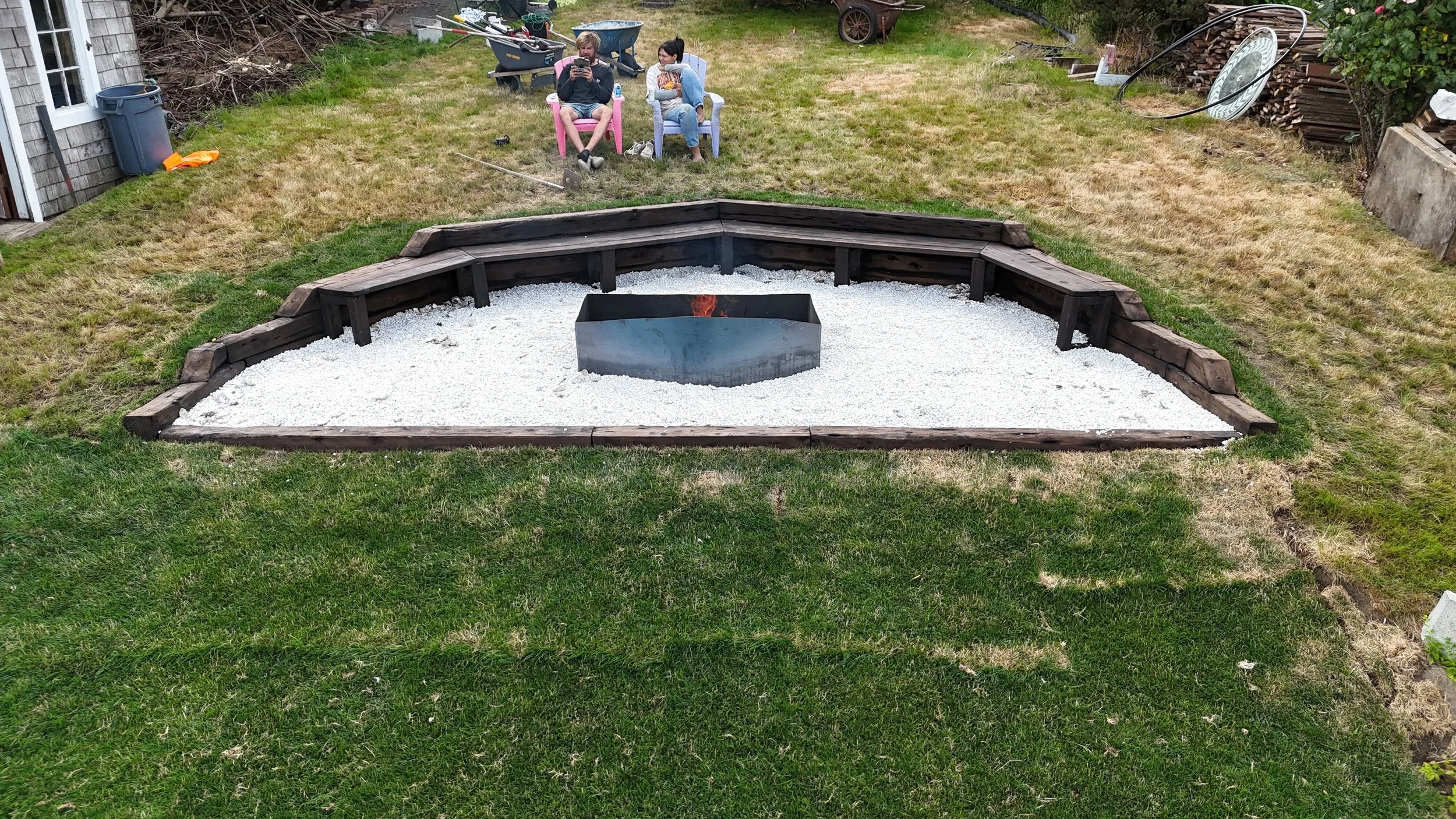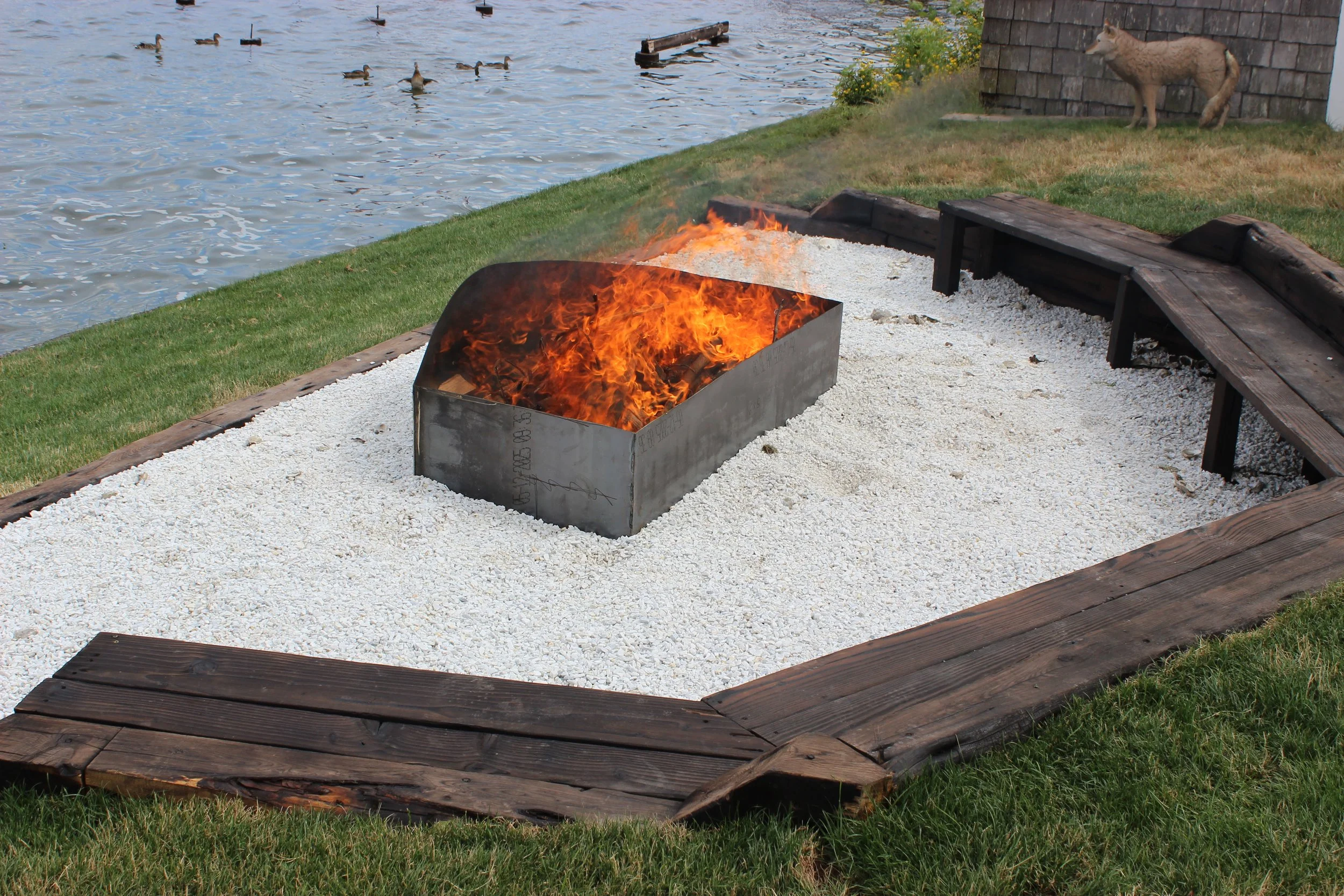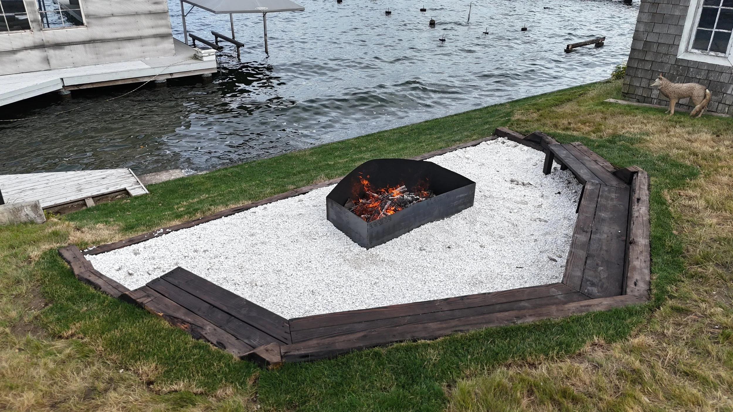 A space to commune with family and friends, and Mother Nature. This sunken fire pit was Ken's and my brainchild to fill a hard-to-reach sinkhole behind his bulkhead. We focus on working with intention. If the norm is a waste of time and money, then we come up with something else, like a sunken fire pit with a base of oyster shell and white rock, balanced with dark Yakisugi. The cherry on top, a welded fire pit, mirroring the dimensions of the seating area itself. We turned it around to complete the balance of Yin and Yang in our design.